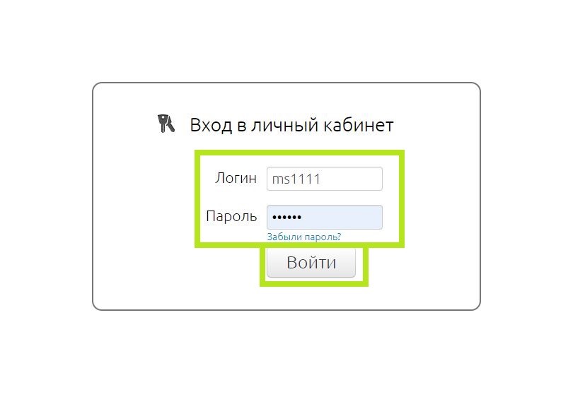 В поле Логин вам необходимо вписать ваш номер Договора (ms1111) и пароль (его вы можете получить в абонентском отделе или запросить по смс ( если уже ранее заходили в личный кабинет).