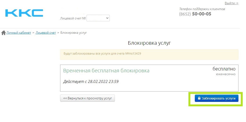 Для приостановки услуг ККС через личный кабинет необходимо авторизоваться в системе с вашими логином и паролем. Перейти на вкладку «Лицевой счет» и выбрать строку «Заблокировать все услуги» или «Блокировать». После в окне подтверждения блокировки подтвердить блокировку услуги или счета.