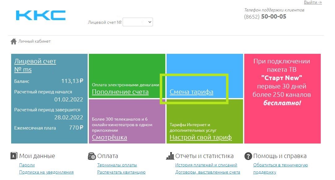 Для этого необходимо авторизоваться в личном кабинете, и выбрать кнопку “Смена тарифа”