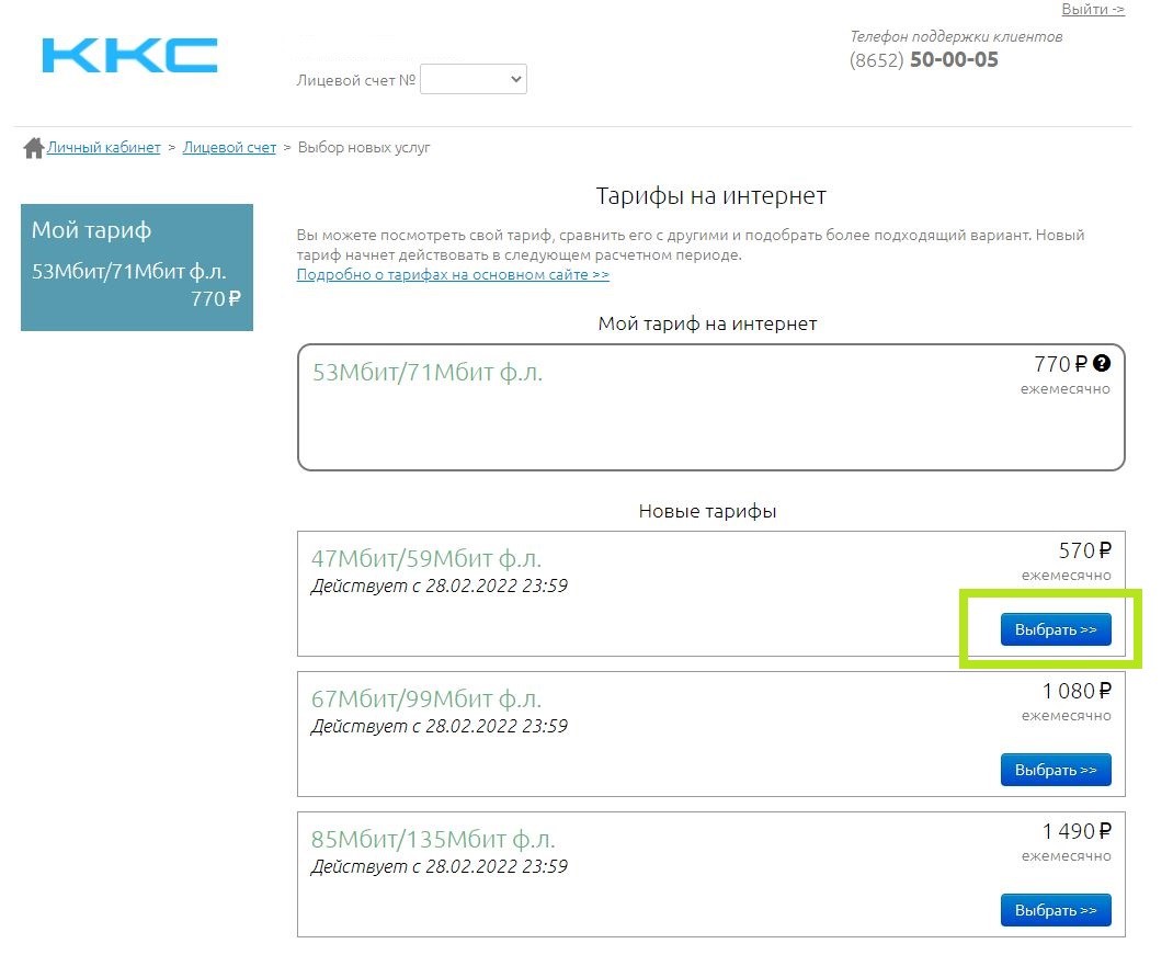 После того, как выберете подходящий Вам по скорости и стоимости тарифный план нажмите на кнопку “Выбрать”. Обязательно подтвердите ваш выбор, для того чтобы сохранить изменения.