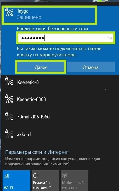 Выбираем нужную нам беспроводную сеть, вводим пароль и нажимаем “Далее”.