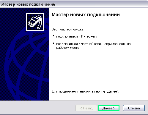 3. После появления "Мастера новых подключений", нажмите на кнопку "Далее"
