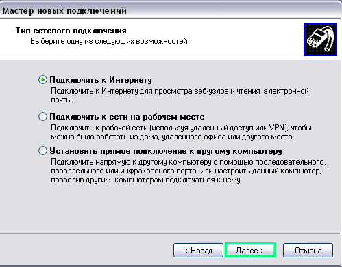 4. В новом окне следует выбрать пункт "Подключить к интернету" и нажать на кнопку "Далее"