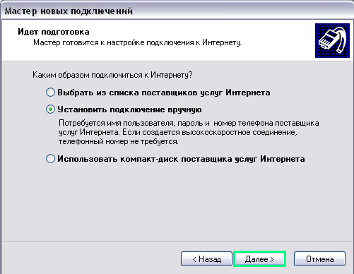 5. В следующем окне выбираем пункт "Установить подключение вручную" и нажимаем на кнопку "Далее"