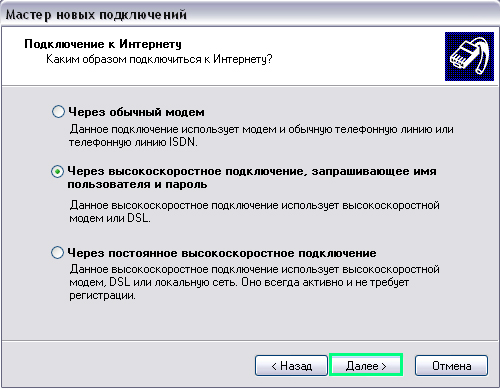 6. Далее следует выбрать пункт "Через высокскоростное подключение" и нажимаем на кнопку "Далее"