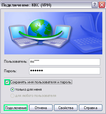 7. В появившемся окне вводим имя пользоватля и пароль(указаны в договоре) и нажимаем "Подключение"