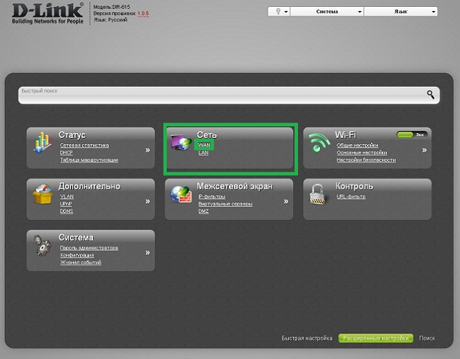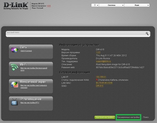 - Откроется Web-интерфейс роутера. Выберите пункт "расширенные настройки"