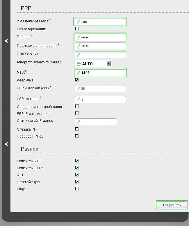 - В поле "MTU" введите значение 1492 и поставьте галочку "RIP" в меню разное