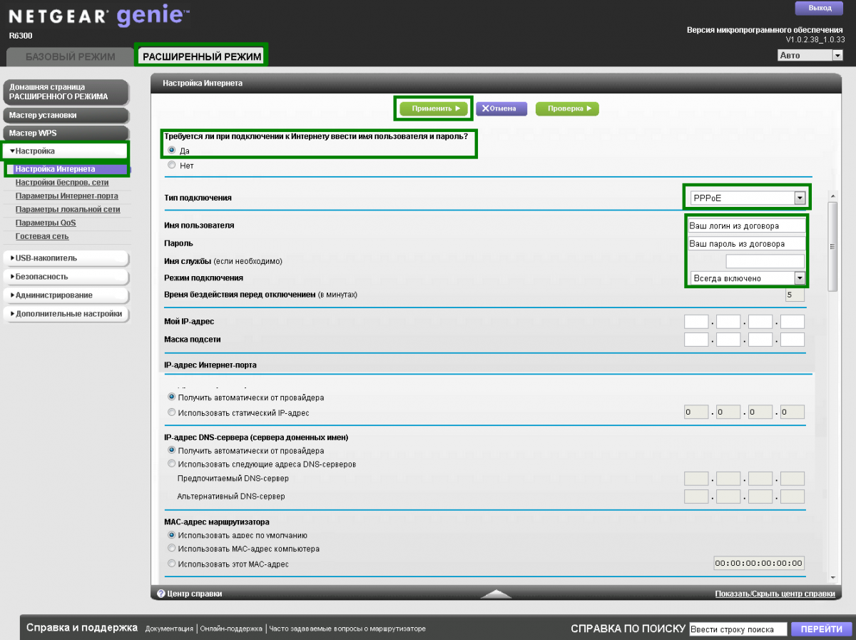 Выберите тип подключения "PPPoE" и введите данные из вашего договора.