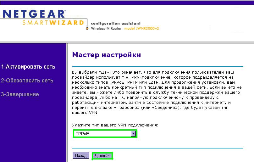 4. Выбрать тип VPN-подключения «PPPoE» и нажать «Далее»