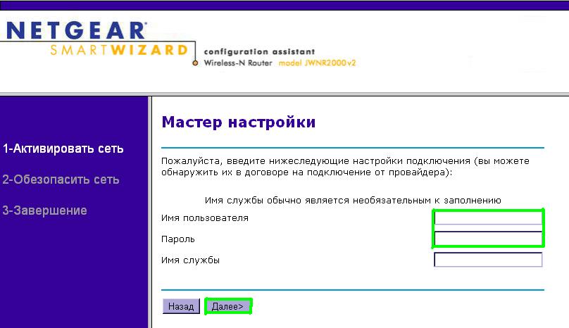 5. В графе «имя пользователя» ввести свой логин, а в графе «пароль» свой пароль и нажать «Далее»