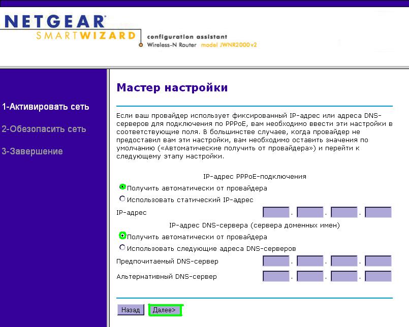 6. В IP-адресе PPPoE-подключения поставить флажок на «Получить автоматически от провайдера». В IP-адрес DNS-сервера поставить флажок на «Получить автоматически от провайдера». Нажать «Далее»