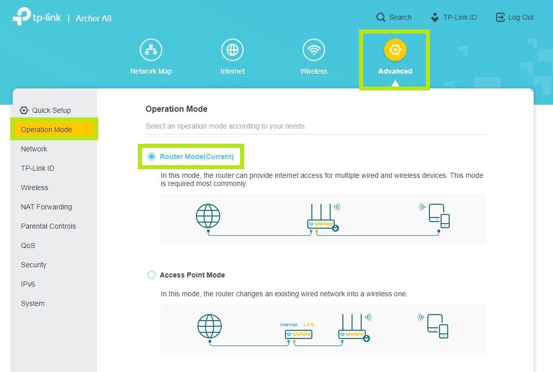 Для этого переходим в категорию “Advanced”. В пункте “Operation Mode” нужно выбрать режим “Router Mode (Current). Этот режим означает, что ваше устройство будет работать в режиме роутера.