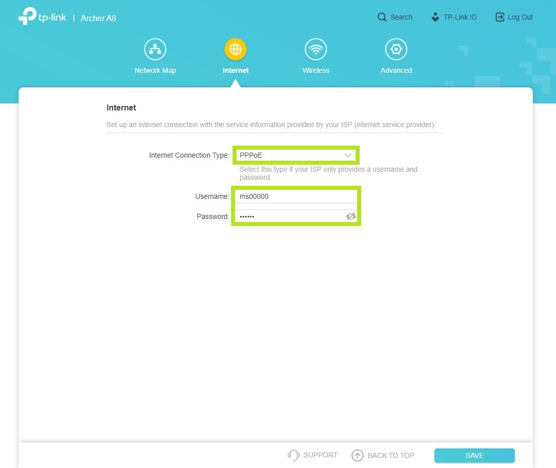 В категории “Internet” в графе “Internet Connection Type” выбираем “РРРоЕ”. “Username” и “Password” указаны в Вашем договоре в графе “Аутентификационные данные”. Обязательно подтвердите пароль и нажмите на кнопку “Save”. Если все ввели правильно – подключение будет выполнено.