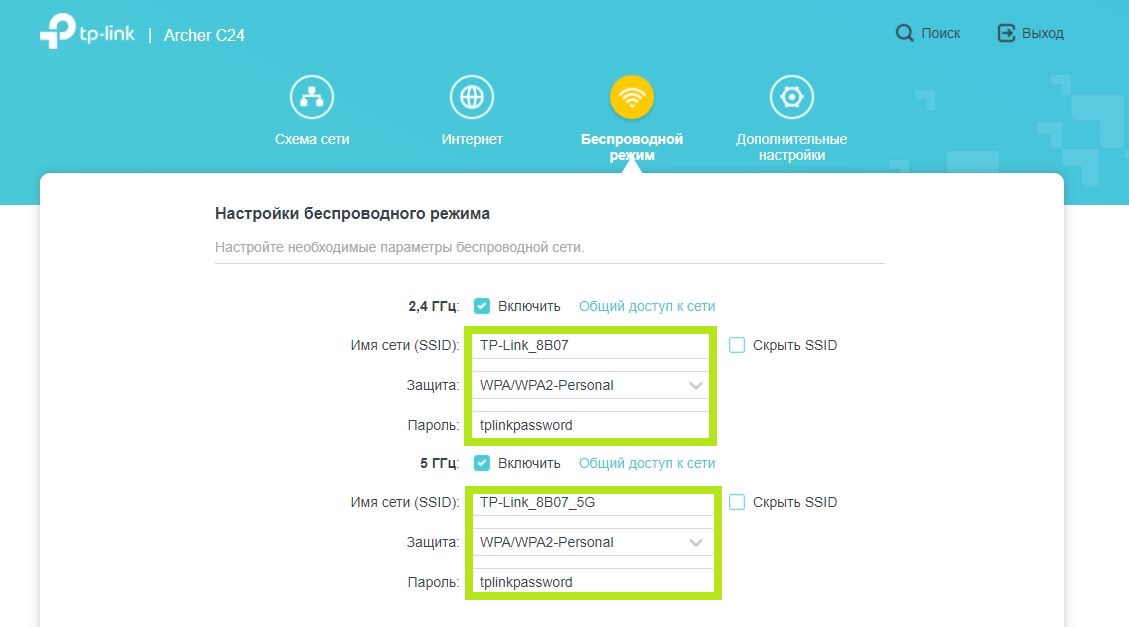 Для дальнейшей настройки Wi-Fi Вам необходимо перейти в категорию “Беспроводной режим”. В настройках сетевого режима вы можете изменить название вашей Wi-Fi сети в строке “Имя сети (SSID)”.