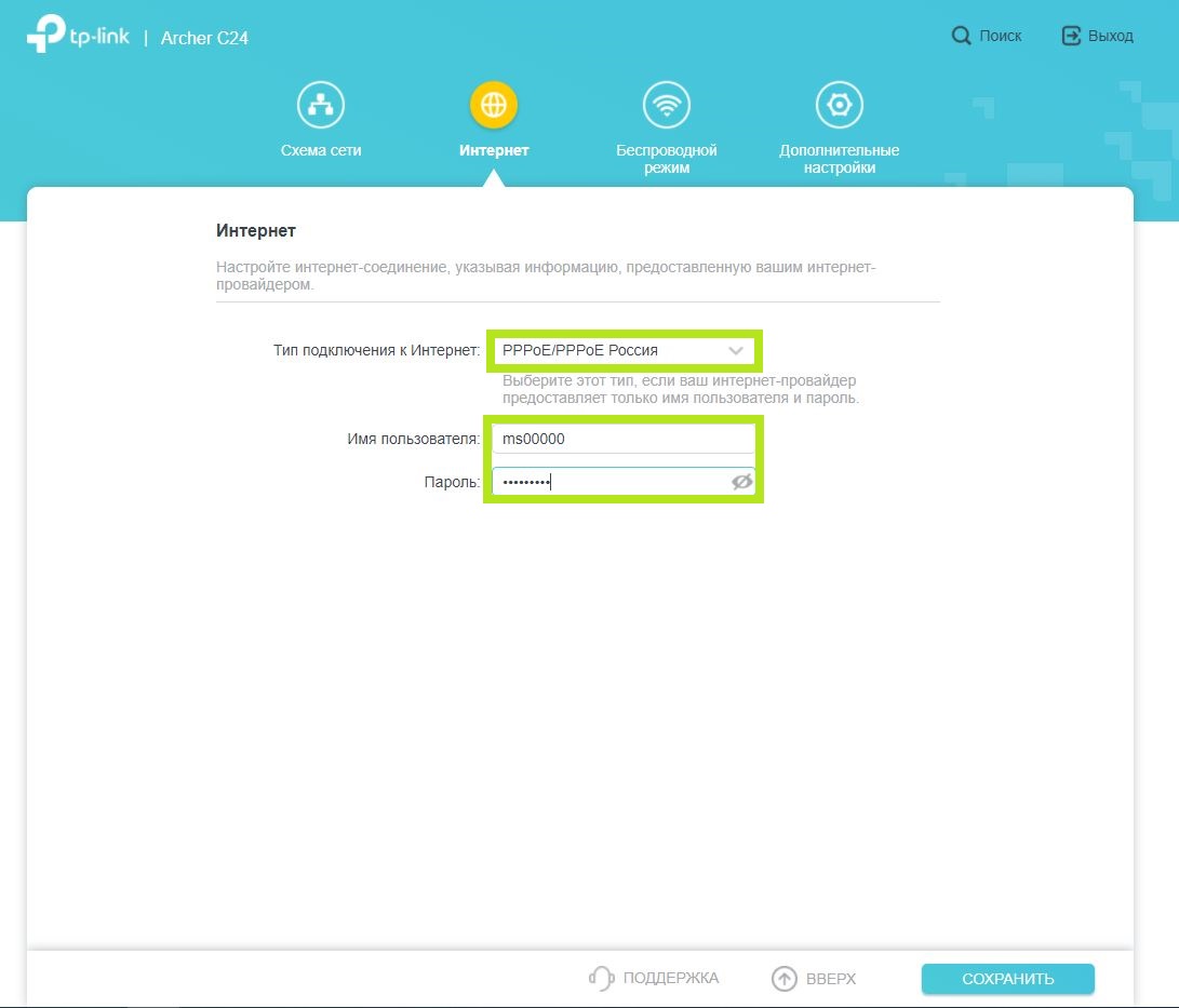 В категории “Интернет” в графе “Тип подключения к Интернет” выбираем “РРРоЕ/РРРоЕ Россия”. “Имя пользователя” и “Пароль” указаны в Вашем договоре в графе “Аутентификационные данные”. Обязательно подтвердите пароль и нажмите на кнопку “Сохранить”. Если все ввели