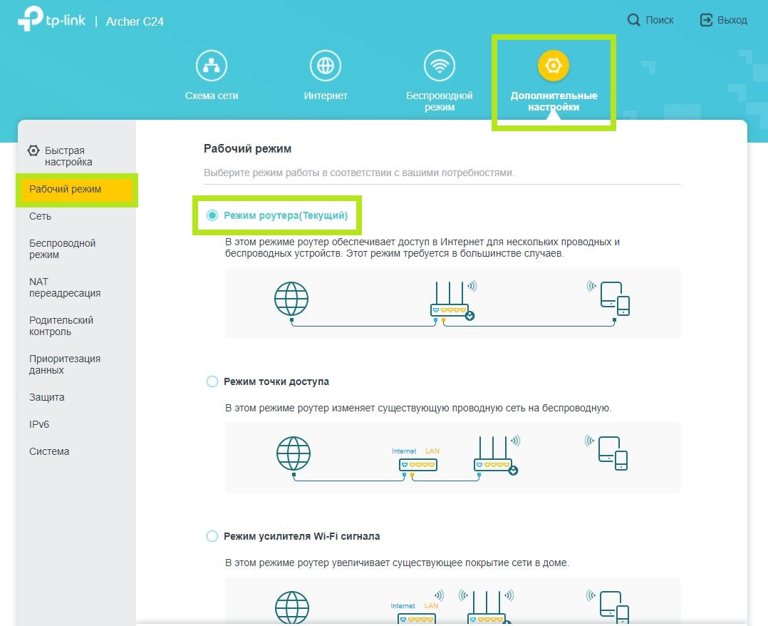 Для этого переходим в категорию “Дополнительные настройки”. В пункте “Рабочий режим” нужно выбрать режим “Режим роутера