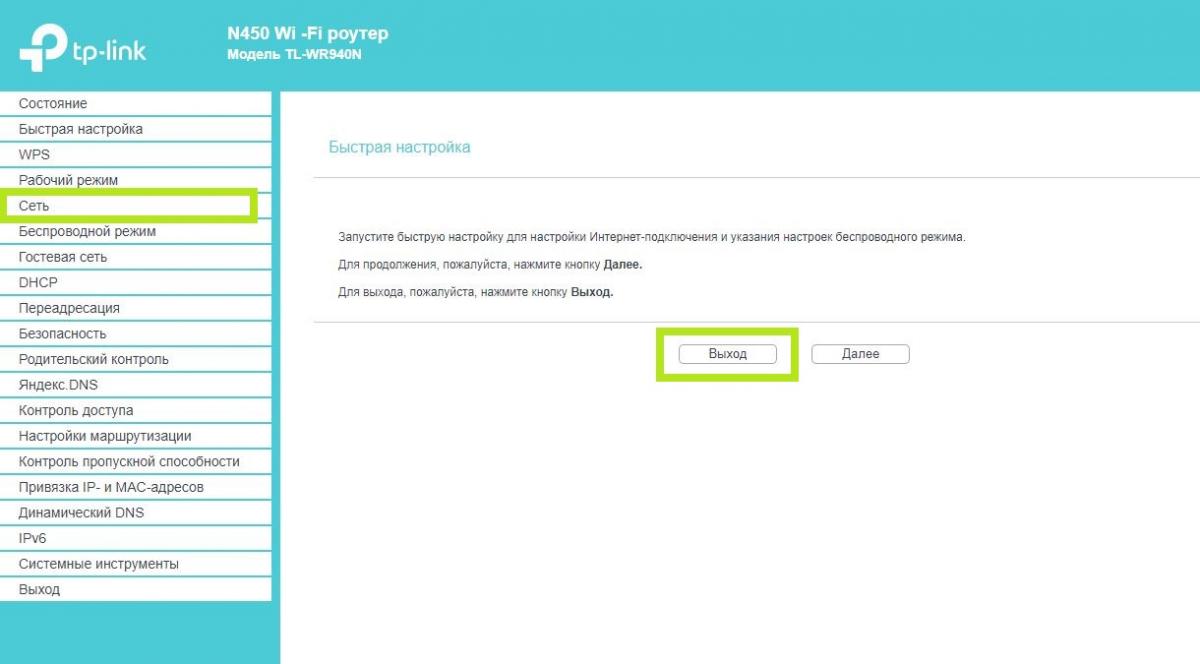 После авторизации откроется интерфейс роутера. Выходим из мастера быстрой настройки нажав “Выход”. В столбце слева нужно выбрать пункт “Сеть”.