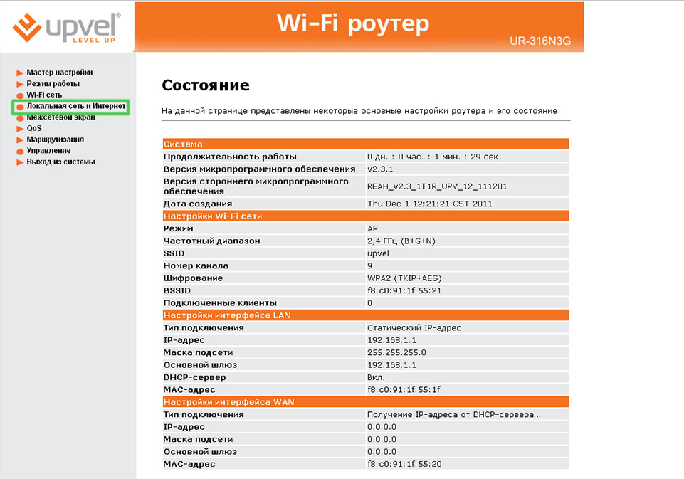 3. Откроется Web-интерфейс роутера. Перейдите в раздел "Локальная сеть и интернет"