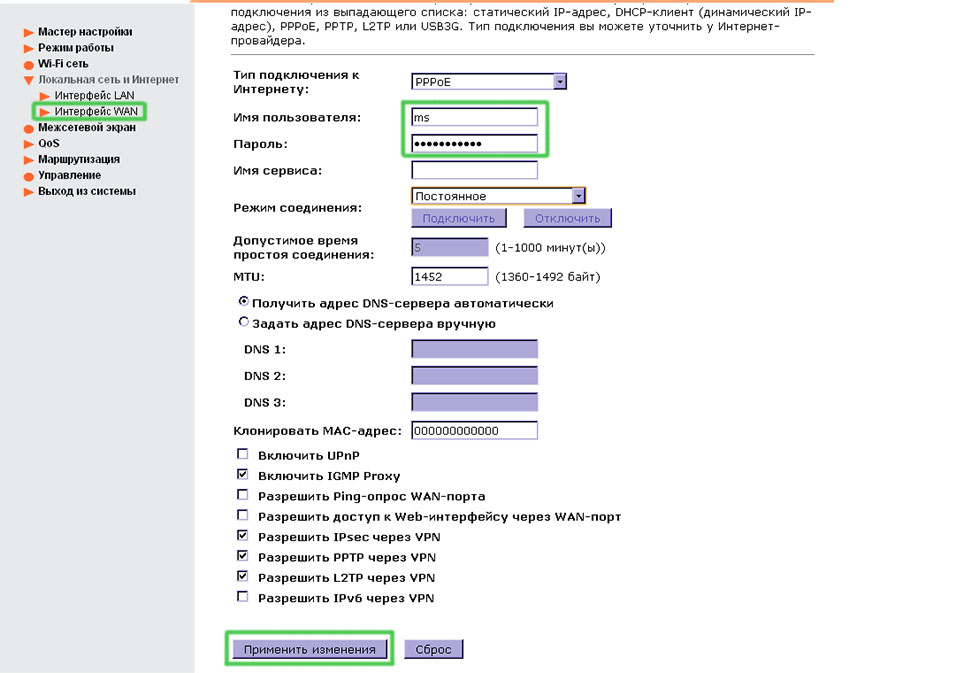 5. Выберете тип подключения "PPPoE" и введите "Имя пользователя" и "Пароль" согласно вашему договору