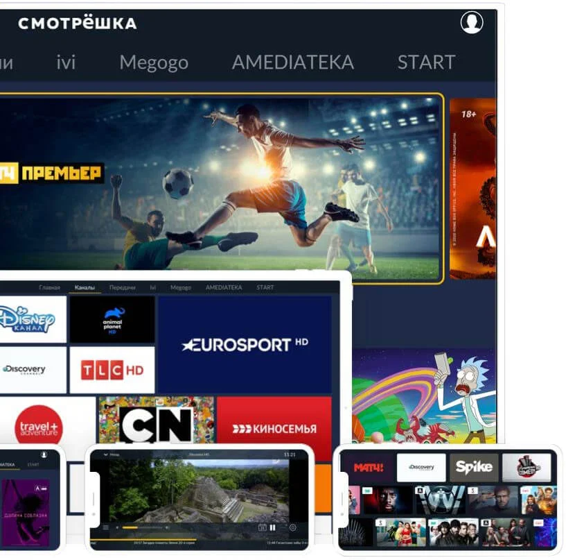 Вы так же можете установить приложение «Смотрешка» на SmartTV, собственную приставку и другие устройства – смартфон, планшет, ноутбук и персональный компьютер.
